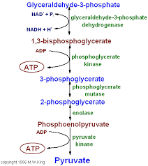 2 molecules of PEP (C3H3O3P1) + pyruvate kinase + 2 ADP → 2 molecules of pyruvic acid (C3H4O3) + 2 ATP